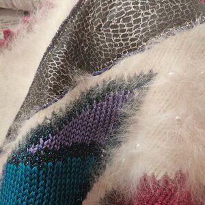 Oozing with character! Vintage knit sweater in fuchsia with patterns of navy, teal, violet, and black. Jazzy 80s sections include fuzzy white with pearl decals and faux snakeskin. Size medium