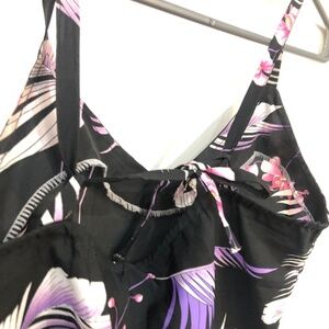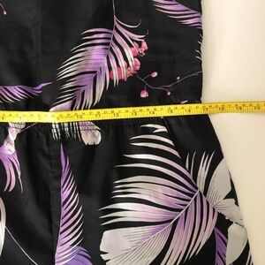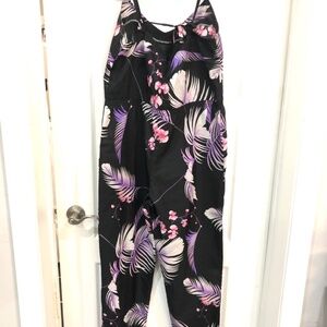 Someone’s cool sewing project from 1980s. Black/pink/purple tropical palm print summer jumpsuit with pockets, adjustable straps.