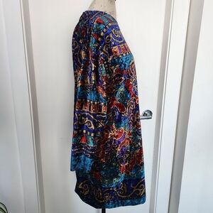 Royal purple blue burgundy & gold jewel toned Baroque pattern velour long sleeve midi shift dress, by TOGETHER!