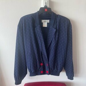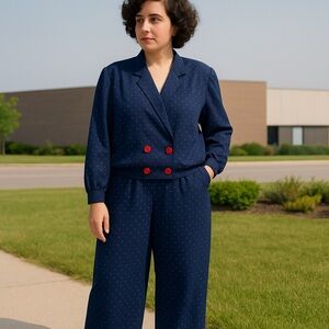 Elegant navy blue suit featuring stylish red button accents. Perfect for a chic and comfortable look.