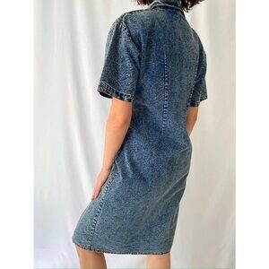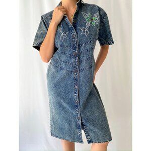this fabulous vintage denim piece is quintessential 80s style! the short sleeved collared dress features a front metal button closure, slightly padded shoulders (which can be removed at your discretion), flared short sleeves and a fitted silhouette. beautiful embellishments with floral motifs adorn the front of the dress, consisting of silver stitching and embroidery, greenish purple beads, iridescent green sequins and red gems. the fabric is a medium weight pure 100% cotton, making this dress an eye catching yet comfortable piece to wear.