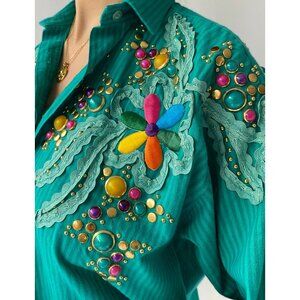 Rare! this is a crazy cool 2 piece set from the 80s or early 90s in amazing vintage condition. the collared shirt is a turquoise color with a subtle pinstripe design, and it features long sleeves, a seven front button closure, two buttons on each sleeve, and a rounded bottom hemline at the back. there are amazing rainbow embellishments and embroideries that bedazzle the front and the back of the shirt and the jeweling is all hand done and it is attached to the shirt by prongs, not by glue.