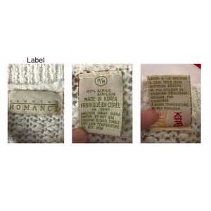 this vintage knit sweater by Country Romance from the 80s or early 90s is so cute and gives major grandmacore vibes! the sweater has a cream and green colored knitted base, and it features multicolor floral fabric appliques and lovely beaded embroideries throughout. the sweater is long sleeved with a high crew neckline, and the fabric is a pure acrylic that is loosely woven and a bit see through. the sweater is warm and slouchy and the garment is unlined, and made in korea.
