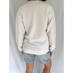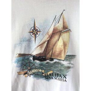 this lovely vintage pullover sweater from the late 80s features a nautical graphic of a sailing boat, compass and boat wheel on a body of water, and a text that reads “bluenose halifax nova scotia” (art credit: golden silk screening 1989). the body of the sweater is white and it is long sleeved with a crew neckline, and ribbed at the cuffs and bottom hem. the fabric is a thick cosy cotton blend, and the sweater has a pullover closure.