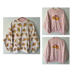 this is an adorable and puffy reversible sweatshirt from the 80s with a subtle holiday theme- I love that the patterns are different on both sides, meaning that it is basically two sweatshirts in one! on one side, the sweater has a light pink body and it features a colorful graphic of two cartoons flying in a helicopter, one with a helmet that read “santa bear” (art credit: 1987 dayton hudson). the graphic continues on the back of the sweater where you can see the backside of these cartoons. the reversed side of the sweatshirt has a white body and and all-over-print of this same graphic all over. the sweatshirt is untagged but it feels like a pure cotton or a cotton blend, and the fabric is super soft and puffy, as it has two layers of materials. the long sleeved sweater has a crew neckline, is ribbed on the sleeves, neckline and bottom hem, and the silhouette is nice and boxy.