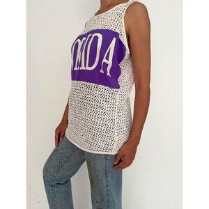 RAD! this unisex vintage tank top “made in the USA” from the late 80s or early 90s has such a fun and bold retro look, with its bright purple fabric panel at the front, and a faded text that spells out “FLORIDA.” the shirt features a cream coloured woven mesh body (that is slightly see through, as it is an open weave), a crew neckline and wide straps. the fabric is a lightweight 100% cotton that is unlined.