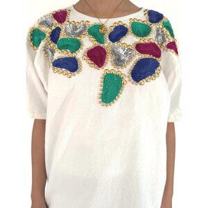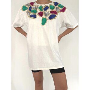 80s vintage white rainbow embellished sequins retro costume party cotton tshirt