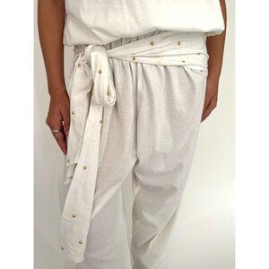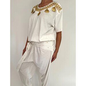 80s white embellished gold seashell retro loose cotton pant one piece jumpsuit
