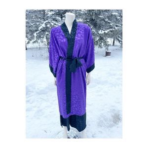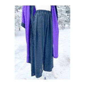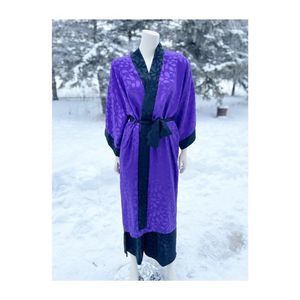 One Size on tag. 100% Polyester Satin Jacquard fabric. Made in Canada. Union made/Union Label. Maxi Length Duster Coat or Robe with detached waist belt ties. High waist, wide leg trousers/lounge pants in matching fabric/colors. No stains, holes or tears. Pet and smoke-free studio.