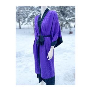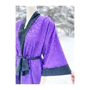 80s Diamond Tea Satin Loungewear Set Kimono Sleeve Duster Robe Trousers Purple B