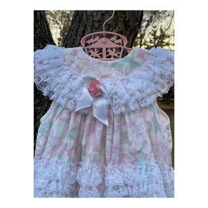 Round neckline, double button closure to back. Triple tier lace bib collar. Sleeveless. Full circle skirt with triple tier lace detail. White Satin bow and pink satin rose. White, Pastel pink and green daisy floral print. No stains, holes or tears. Pet and smoke free home.