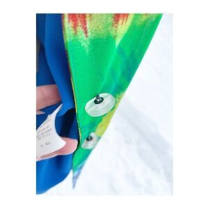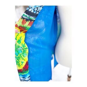 Size Small on tag. Rayon shell, polyester lining. Fabric from Germany. Made in the USA. Multi-Layer sheer chiffon blazer in a colorful mixed print, art-to-wear pattern. V-neckline, 3/4 length sleeves and thick Oval shaped frosted stone buttons with floral decal details. No stains, holes or tears. Pet and smoke-free estate.