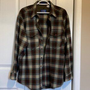 This beautiful Pendleton Outdoorsman shirt has never been worn or washed. It is in pristine condition. Size XL. Measures approximately 26 inches P2P and 28 inches from shoulder seam to bottom hem.