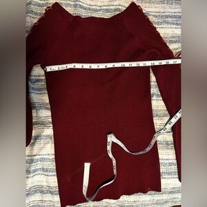Chic off-the-shoulder design. Lace-up sleeve accents. Soft ribbed texture.