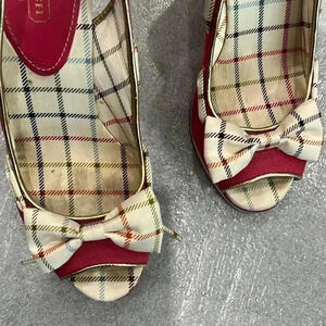 [8B]Coach Twirlino Twirling Open Toe Cork Wedges Bow Detail Pink Plaid
