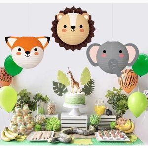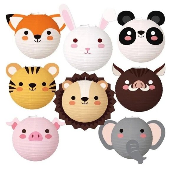 Bring the jungle to your child's birthday party with these 8 animal lantern decorations. Made of paper, these multicolored lanterns are perfect for hanging from the ceiling or trees. The jungle theme will excite your little ones and add an extra touch of fun to the celebration. These lanterns are ideal for kids' parties and safari-themed events. They are not antique and have a modern style suitable for any occasion. Make your child's party an exciting adventure with these delightful animal lanterns.