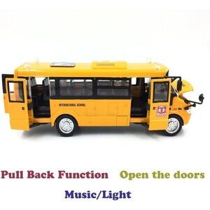 Large bright yellow die-cast school bus with openable doors, Press and push the head of the truck, then sound engine starts working and lights flash.