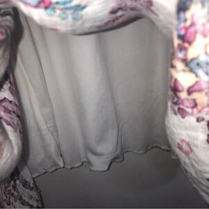 Features: Embroidered lace shoulders Bright white with floral print Back cutout with button Lined Slight high/low hem