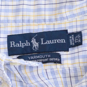 Elevate your wardrobe with the Vintage 90s Ralph Lauren Yarmouth 100% Cotton Pinpoint Oxford Blue and Yellow Plaid Button-Down Dress Shirt in size 17 1/2 36/37. This timeless piece embodies the classic Ralph Lauren aesthetic, combining quality craftsmanship with a stylish plaid design.