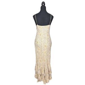 This stunning vintage 1990s slip-style maxi dress is an effortlessly elegant piece, perfect for formal events, garden weddings, or evening occasions. Made by Quintieri, it features a soft beige and ivory abstract floral pattern with delicate gold and taupe tones. The fitted silhouette hugs the body before flowing into a romantic asymmetrical tiered ruffle hem.