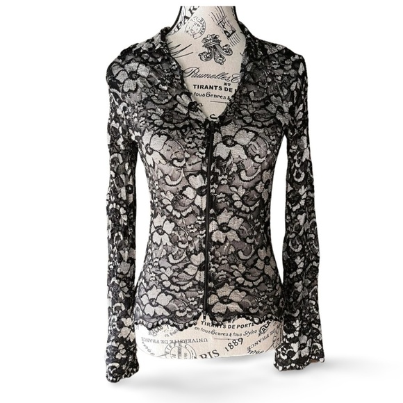 90s Black & Silver Lace Zip Up Y2K Holidays Elegant Blouse