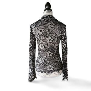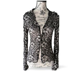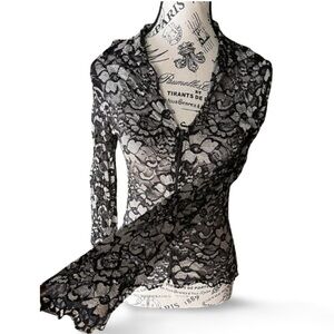 Vintage 90s lace perfection — a sheer black top woven with metallic silver thread, catching the light with a gothic shimmer. Semi-sheer and lightweight, perfect for layering with a bralette or cami. Fitted silhouette with button-front closure and long sleeves, ideal for night-out, festival, or Y2K goth revival looks.