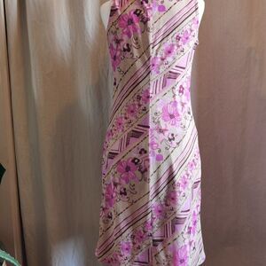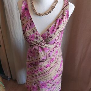 90s Crosover Neckline Midi Dress Print Graphic Pink & Tan Pastel Shift