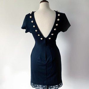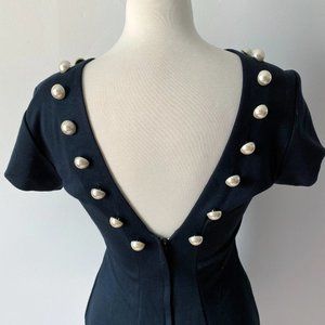 Midnight Blue 1990s pencil dress with iridescent pearl coloured buttons. Classic 50s inspired wiggle silhouette with cinched waist. Large statement pearl buttons trim the collar and deep-V in the back. Feminine lace trim at hem, with zipper closer in the back.