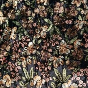 Soft black velvet vest with intricate floral pattern in earthy tones — moss green, rust, ochre and plum.