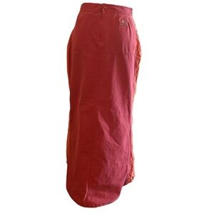 Elevate your wardrobe with this stylish midi skirt. Perfect for any occasion. Zippers and buck at the back, front of skirt has zipper pouch with mesh lining inside. Both sides of skirt has zipper that zips up to thigh. Coral and orange in color. In excellent condition, women’s size 8.