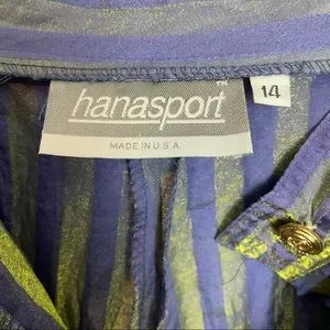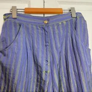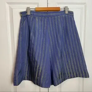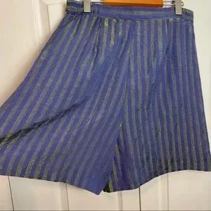 Where to begin?! These are pretty spectacular. Lightweight shorts with metallic striping. Purple and yellow gold intertwine to make a shimmery pair o’ shorts. Zip/gold button closure, with pockets. Marked as size 14. Tags have been removed, so please check msmts for best fit.