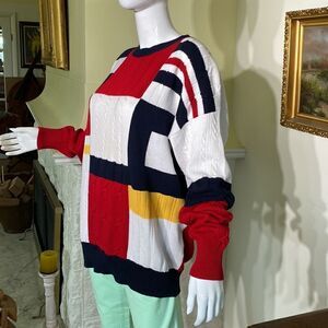 In excellent preowned condition classic vintage 1990’s Nautica cable knit sweater in 100% cotton. Iconic 90’s colour block multi colour pattern in red, white, blue and yellow. Baggy preppy style with a nautical vibe.