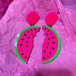 90s Neon Pink and Green Watermelon Slice Statement Earrings Acrylic pierced earrings, brand new 3in x 1.25in Weight each 4g