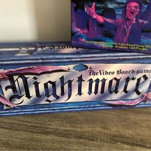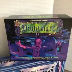 Nightmare II has an open box but the VHS inside is sealed from factory and was never used as per the original owner. The original Nightmare game was played but is in very good condition, no pieces missing as far as I can tell. VHS in good shape. Game board itself is like new, the only thing I could see is that there are a couple of bent game pieces (see photo). Overall though these are in excellent condition!!