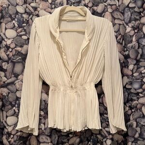 This vintage 90โs cream pleated top offers a sophisticated look for any occasion. Can be used as a blouse, jacket, cover up, layering. Its unique design and soft color make it a versatile addition to your wardrobe. Bodice lined, sleeves not lined. Stretchy waistband. Flowing chiffon feel pleats, make this piece unique and versatile. Full Zip up the front, can be worn open or closed, collar up or down. Enjoy this beauty! ๐ค๐ค๐ค