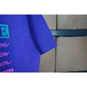 Features: 90s positive message graphic art, purple, Hanes brand, 50-50 cotton poly blend