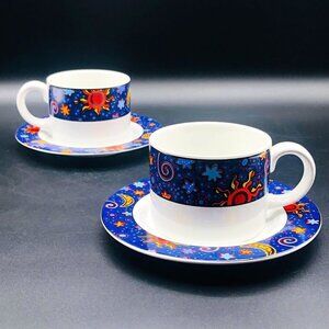 90s SAKURA Stoneware Celestial Cup Saucer Set PAIR Vintage Astral Moon Star Sun
