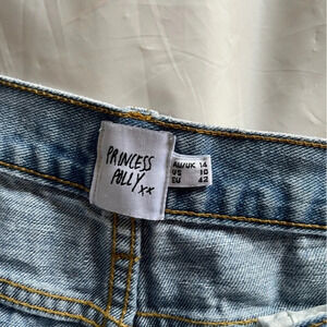 Indulge in the nostalgia of 90s fashion with these woman's denim distressed high waisted jeans by Princess Polly. Sized at 10, these preloved jeans may show signs of wear, featuring a small mark on the front left leg. Otherwise, they are in good condition, ready to bring retro flair to your wardrobe.