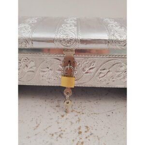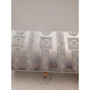 Add a touch of nostalgia and charm with 90s Vintage Book Jewellery Box. Featuring a floral-embossed silver-tone metal exterior with a secure latch on the side, this attractive piece brings an ethnic, Eastern-inspired aesthetic. Lined with rich purple velour, it offers both style and practicality, making it perfect for storing treasures. Ideal as a boho or hippy gift for her.