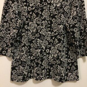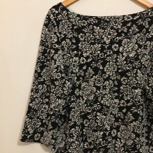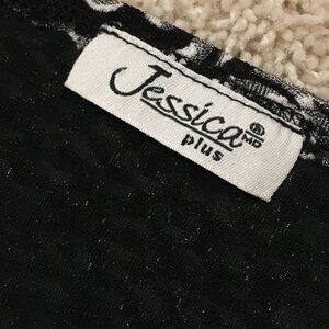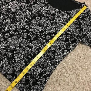 Very good preowned vintage condition, black and white floral print, lacy 3/4 sleeve top by Jessica Plus. This is such a cool top.