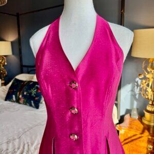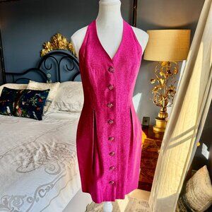 90s vintage vivid pink fuchsia mini dress by Jazz II California, no size tag but fits like a S. Halter neck with back panel cutouts, v neck, ornate gold buttoned front. Material feels like raw silk or possibly an imitation made to feel like it, soft and luxurious feeling. Excellent vintage condition. Bust measures 16.5 inches laying flat, waist measures 14.75 inches flat, hips 19.5 inches flat, length from nape to hem is about 35 inches. Cat friendly, nonsmoking home.