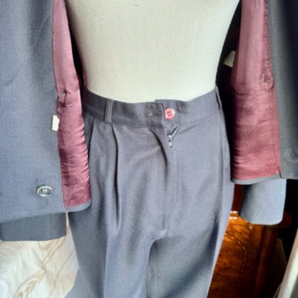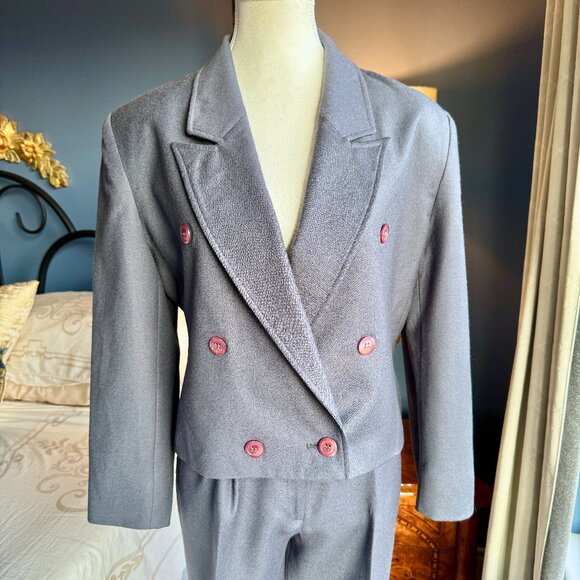 Early 90s gray pantsuit, cropped double breasted blazer and high rise straight leg pants. From Jaki Petites, blazer is size 8, pants size 4, 100% wool, made in Canada. Shoulder pads! In great used vintage condition.