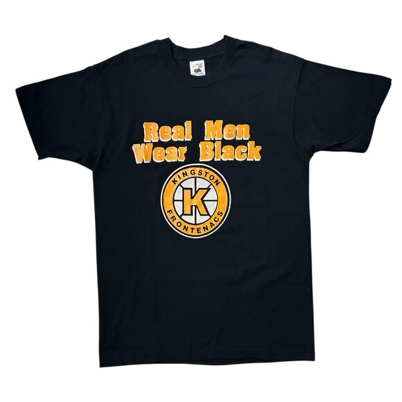 90s Vintage OHL Hockey Slogan Tee - "Real Men Wear Black" - Kingston Frontenacs, single stitch