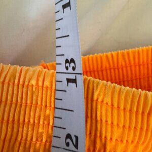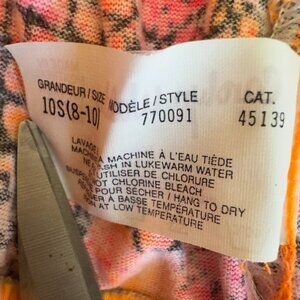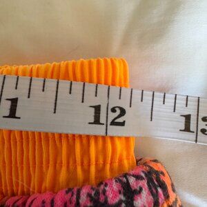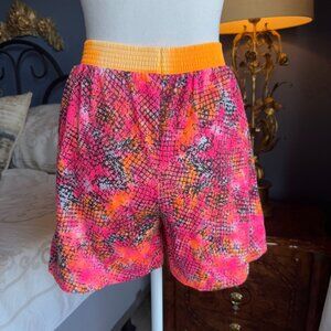 Early 90s vintage neon pink, orange, and white with black pattern one piece bathing suit and shorts. Bathing suit is size 7/8 (fits like a small) by Baltex and made in Montreal. Underwire cups, high cut front, scoop neck front, and low back. The swimsuit's "trim" elastic has given out but the 96% cotton 4% spandex material maintains its perfect shape still. The shorts are a size 8S, have slanted pockets on the size, wide orange elastic waistband that has some sun fading, and are 50% cotton 50% polyester by Carolyn Waldo, in Montreal (same factory). The shorts waist measures 12.25 inches laying flat (can stretch to a 28 inch waist easy), inseam is just under 3.5 inches, and rise is about 13 inches. Cat friendly, nonsmoking home.