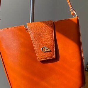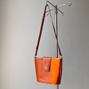 🍂 90s Vintage Orange Leather Crossbody Bucket Bag with Gold Equestrian Accent