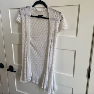Elegant white delicate open knit sweater from Le Chateau. Beautiful knit design throughout this long open cardigan. Perfect for layering.