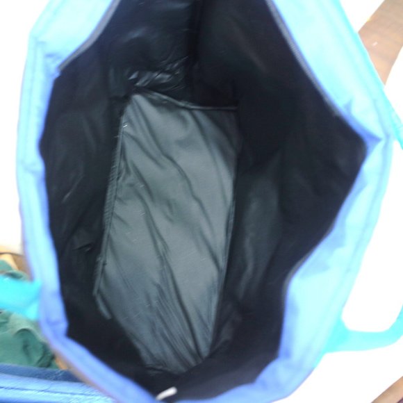 Retro green and blue insulated cooler tote bag! Great for the beach. Clean inside. Zipper closure. In great shape minus a few spots on the front (see last pic). The pictures may make it look turquoise but it's more of a deep green and royal blue stripe.