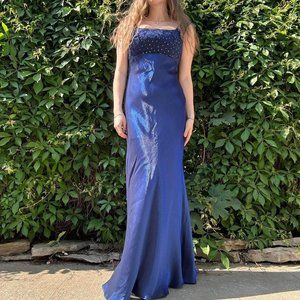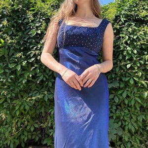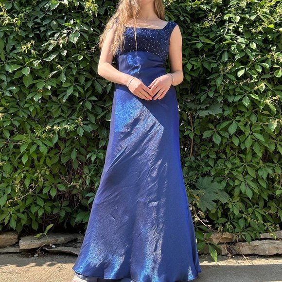 Navy iridescent, floor length, prom dress, rhinestone embellishments, floral embroidery, vintage maxi, formal gown, evening wear, 90s style, glamorous