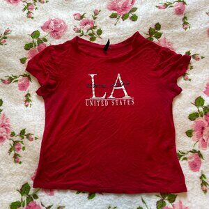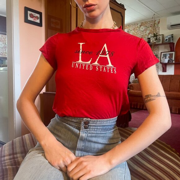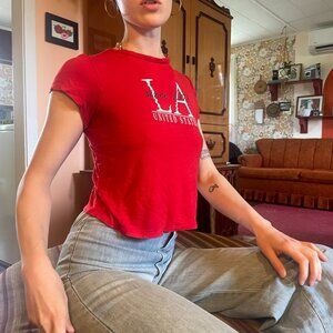 Tags: LA graphic tee, red cropped top, red crop top, vintage 90s, vintage style, red cropped shirt, red cropped baby tee, baby t shirt, graphic tee, vintage style graphic tee, short sleeved, half sleeve, bright red, tourism shirt,