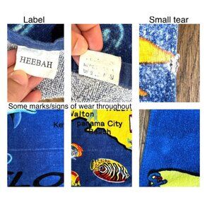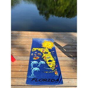 this is a cute and kitschy vintage souvenir beach towel from the 90s featuring a colorful print on the front of a map of Florida ("sunshine state") and various cities and landmarks, along with illustrations of the beach, palm trees, dolphins, tropical fish, flamingos, and more. the towel is made of a fairly thin cotton (rather than being plushy or absorbant) which was standard for 90s era. the towel is printed on one side and is blank/white on the other side, and although it has been well loved, it is generally good shape. a perfect retro accessory that is super packable and lightweight to carry around in your tote!